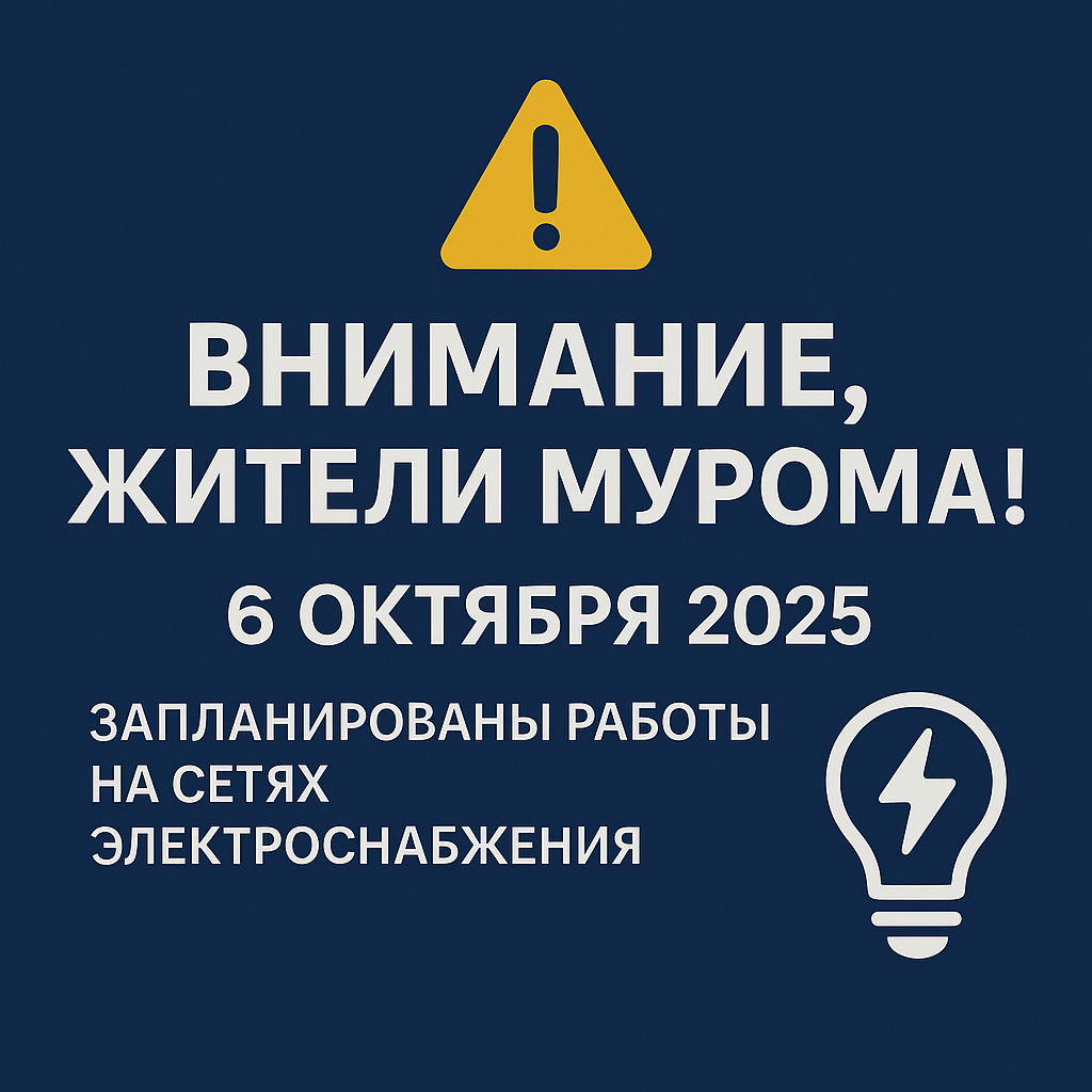 ⚠️ Внимание, жители Мурома! На 6 октября запланированы работы на сетях электроснабжения, которые приведут к временным отключениям электроэнергии в нескольких населённых пунктах.